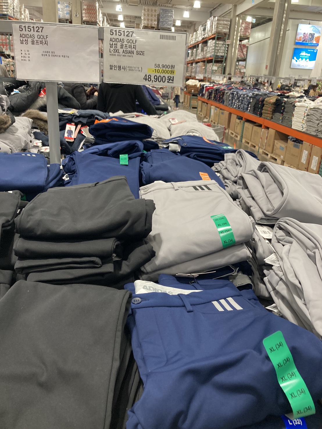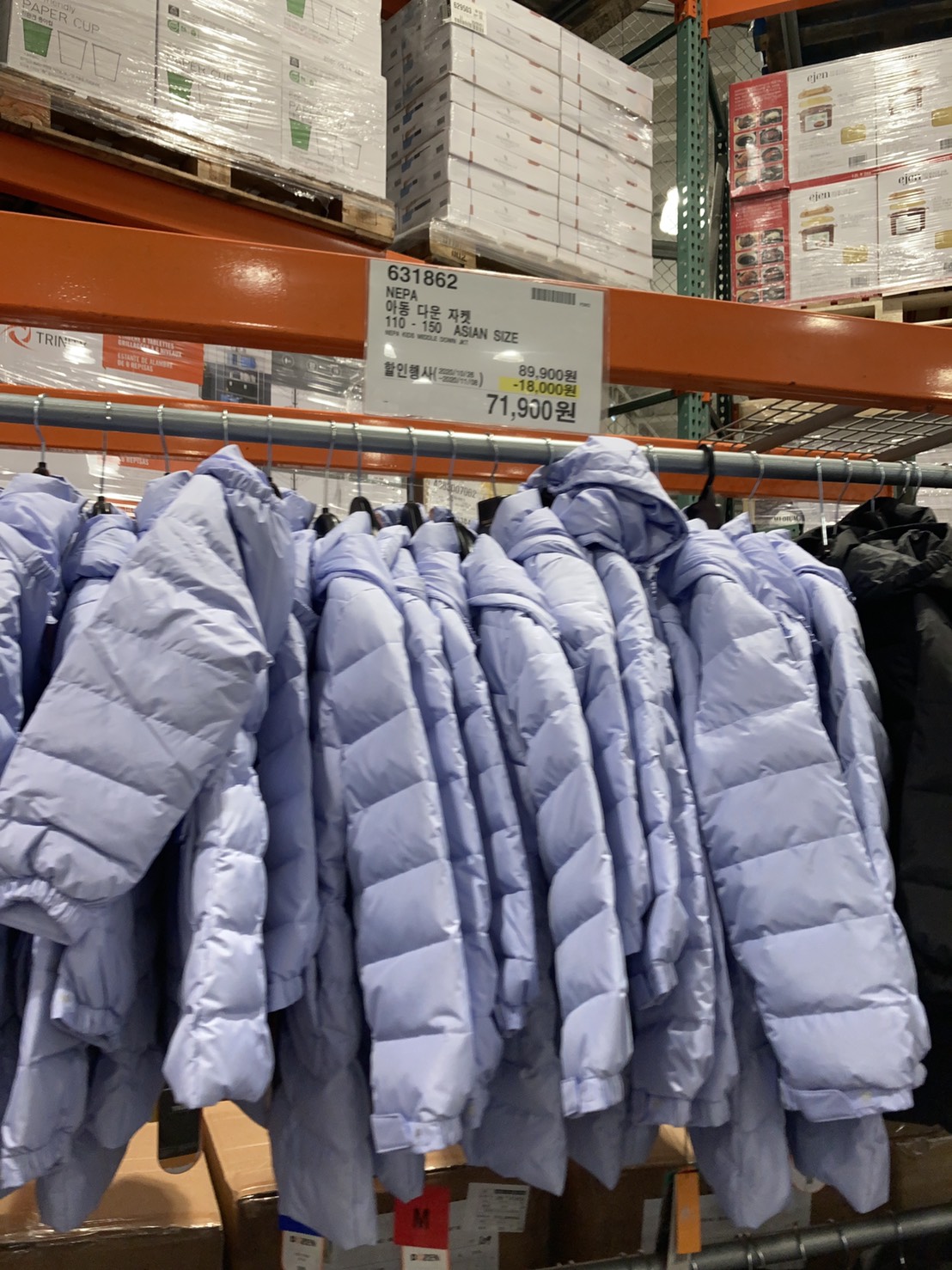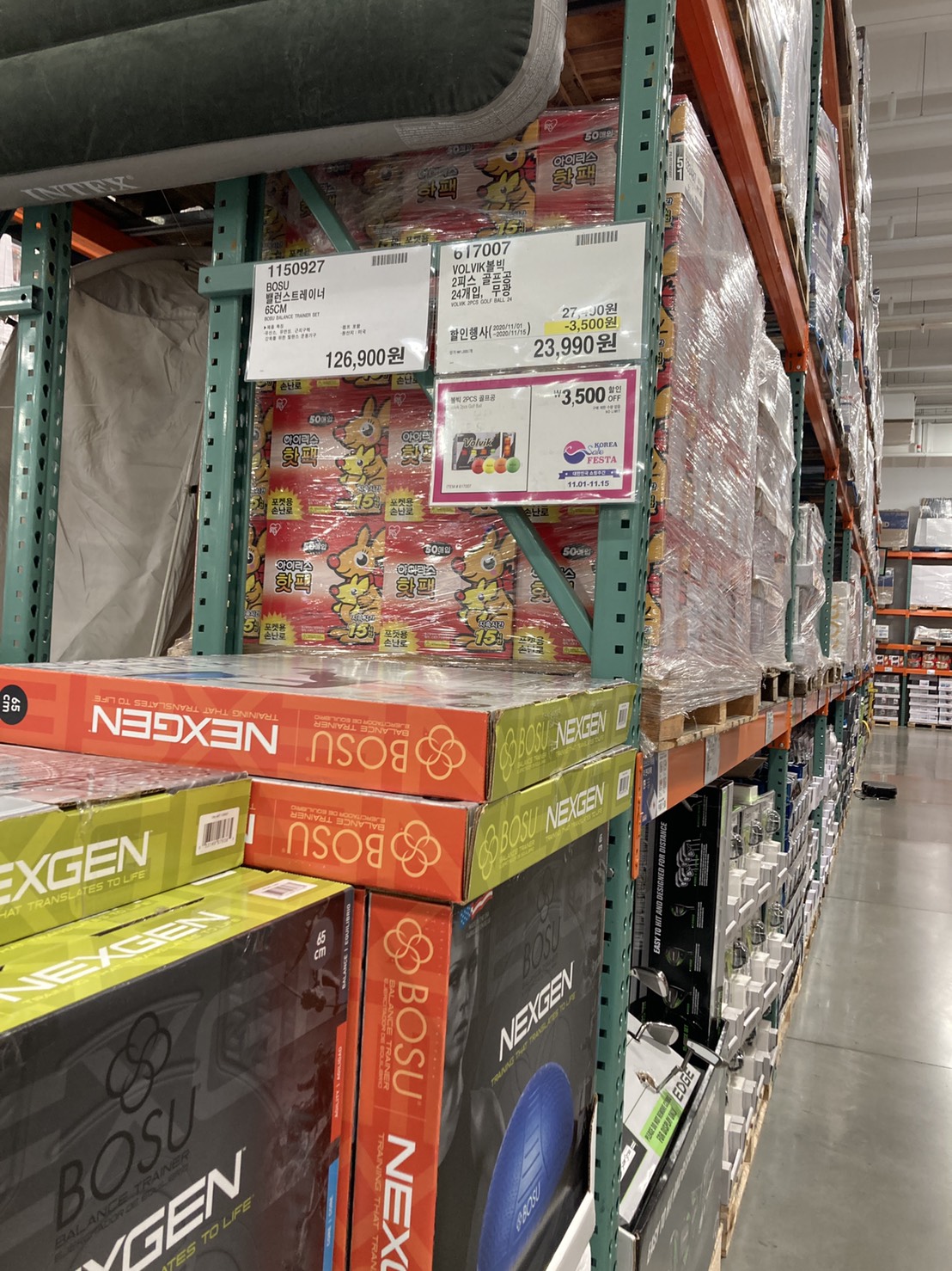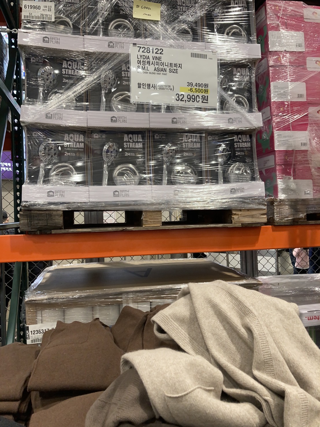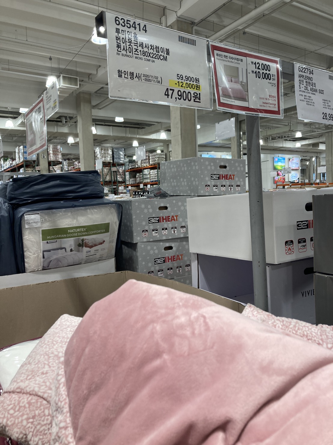 코스트코 광명점 11월 할인상품. 식품에 이어서 의류와 생활용품. 날씨가 추워지니 따뜻한 의류와 온풍기 이불 등 겨울 생활용품이 많이 전시되어있다.