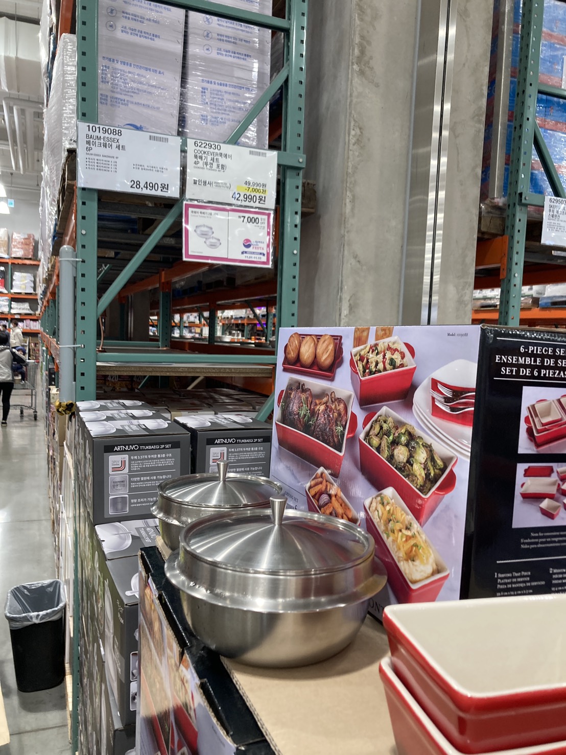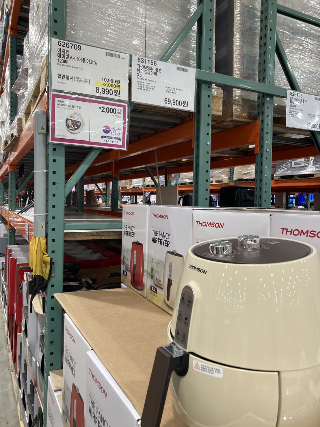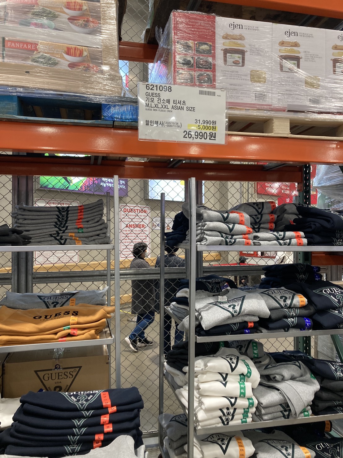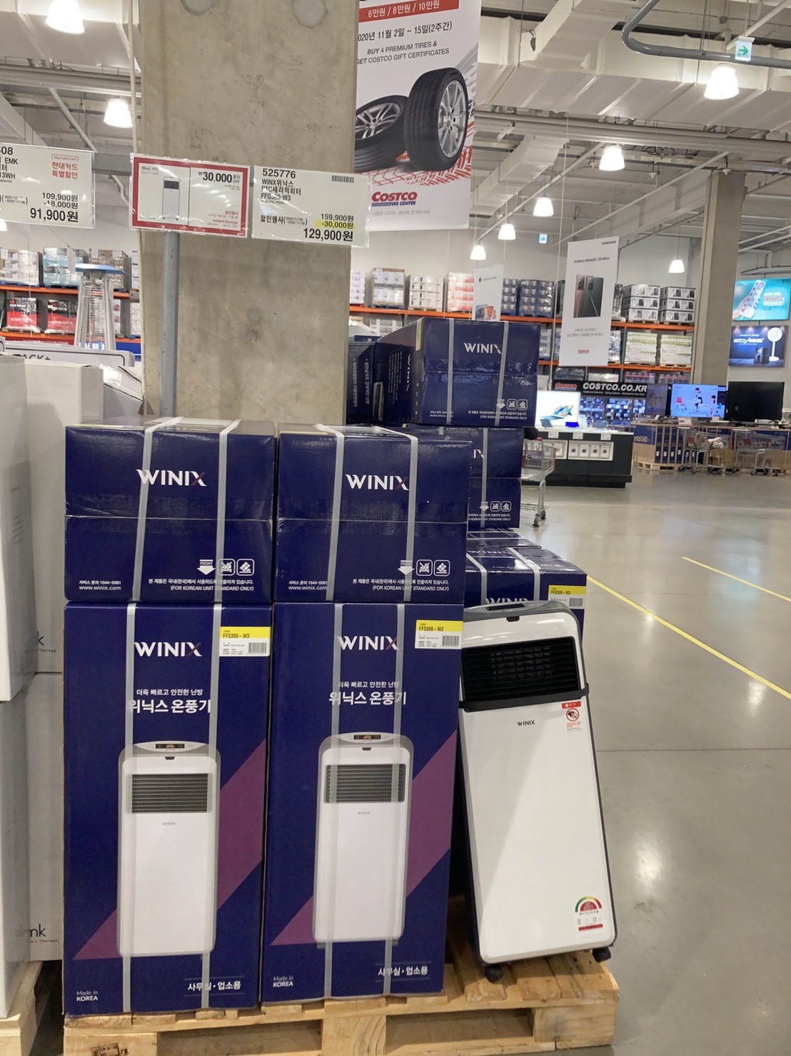 코스트코 광명점 11월 할인상품. 식품에 이어서 의류와 생활용품. 날씨가 추워지니 따뜻한 의류와 온풍기 이불 등 겨울 생활용품이 많이 전시되어있다.