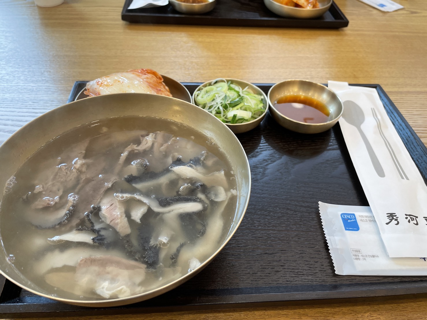 내가 주문한 특별곰탕. 이전에는 양이 많았는데 이젠 특으로도 고기가 부족해 보인다. 바이러스 때문인지 파채는 이제 테이블 위에 두지 않고 이렇게 개별 종지에 소량만 제공해준다. 원하면 더 가져다준다. 국물은 변함이 없이 맑고 좋다. 쓰린 속을 부드럽게 어루만져주는 느낌이랄까.. 해장국으로 최고다.