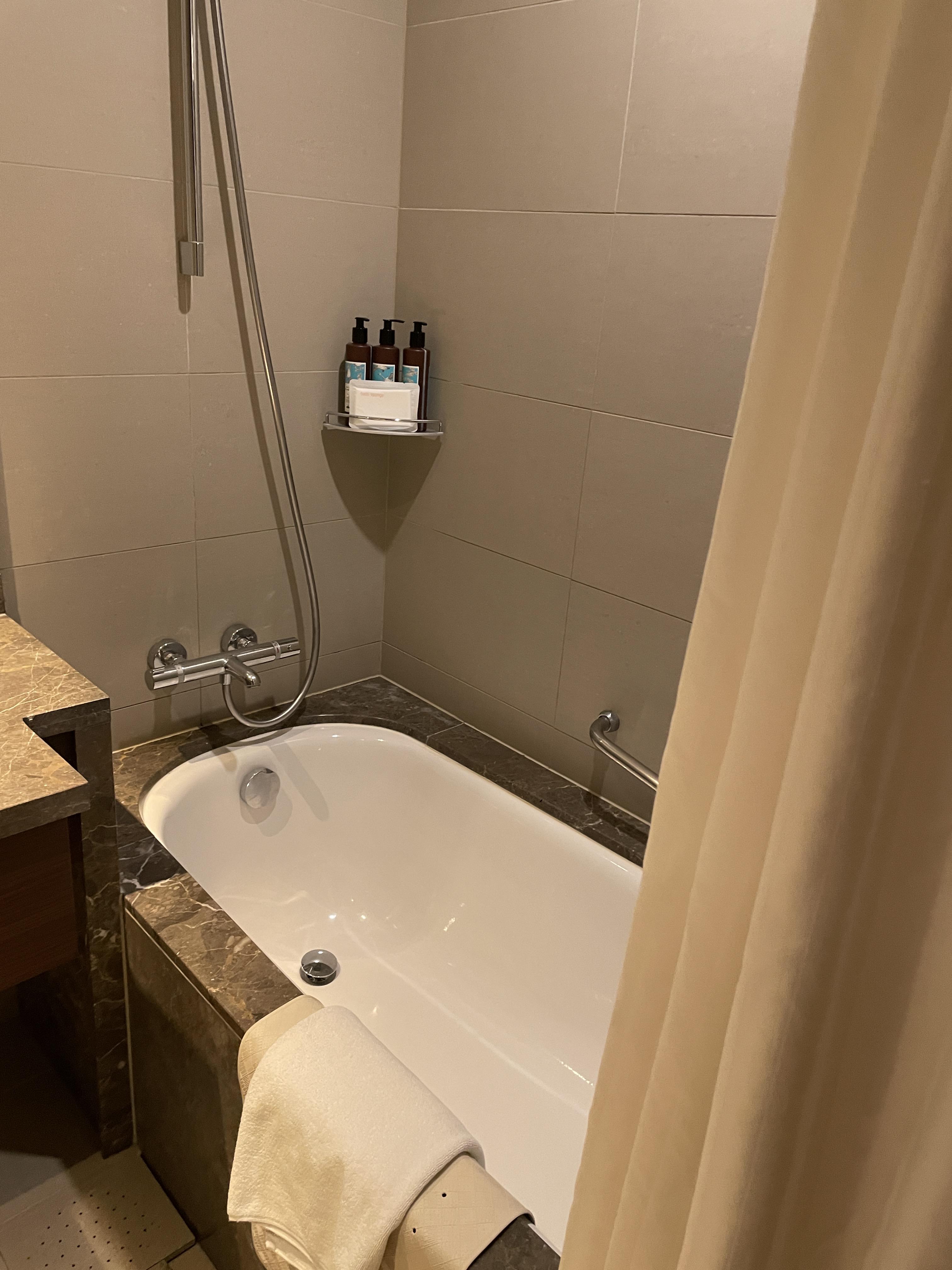 욕조. 신라스테이에서는 제공않는 샤워 스펀지까지 제공해서 이점은 좋다. 하지만 아무리 환경을 생각해도 다회용 어메니티는 요즘 같은 시대엔 조금 망설여진다. 그럼에도 가성비 좋은 비즈니스호텔이다.