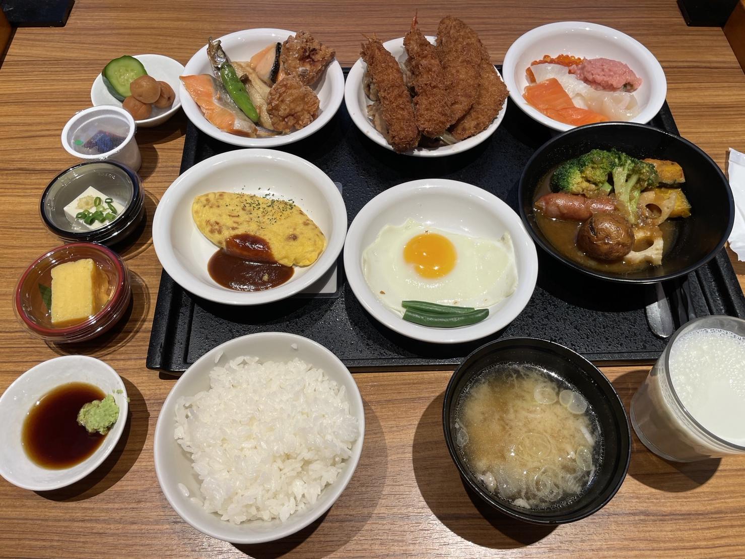 해산물이 유명한 홋카이도 답게 연어, 참치, 연어알, 가리비 등 해산물과 계란요리 두부 튀김요리 그리고 수프카레까지 작은 그릇에 포장되어 제공된다. 아침부터 영양만점의 푸짐한 한상차림이다.