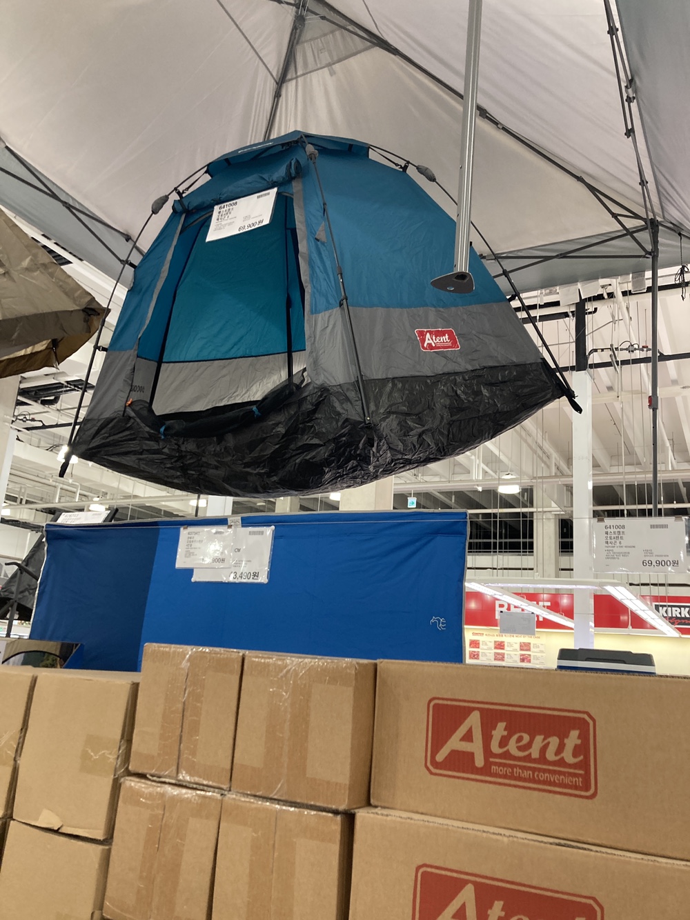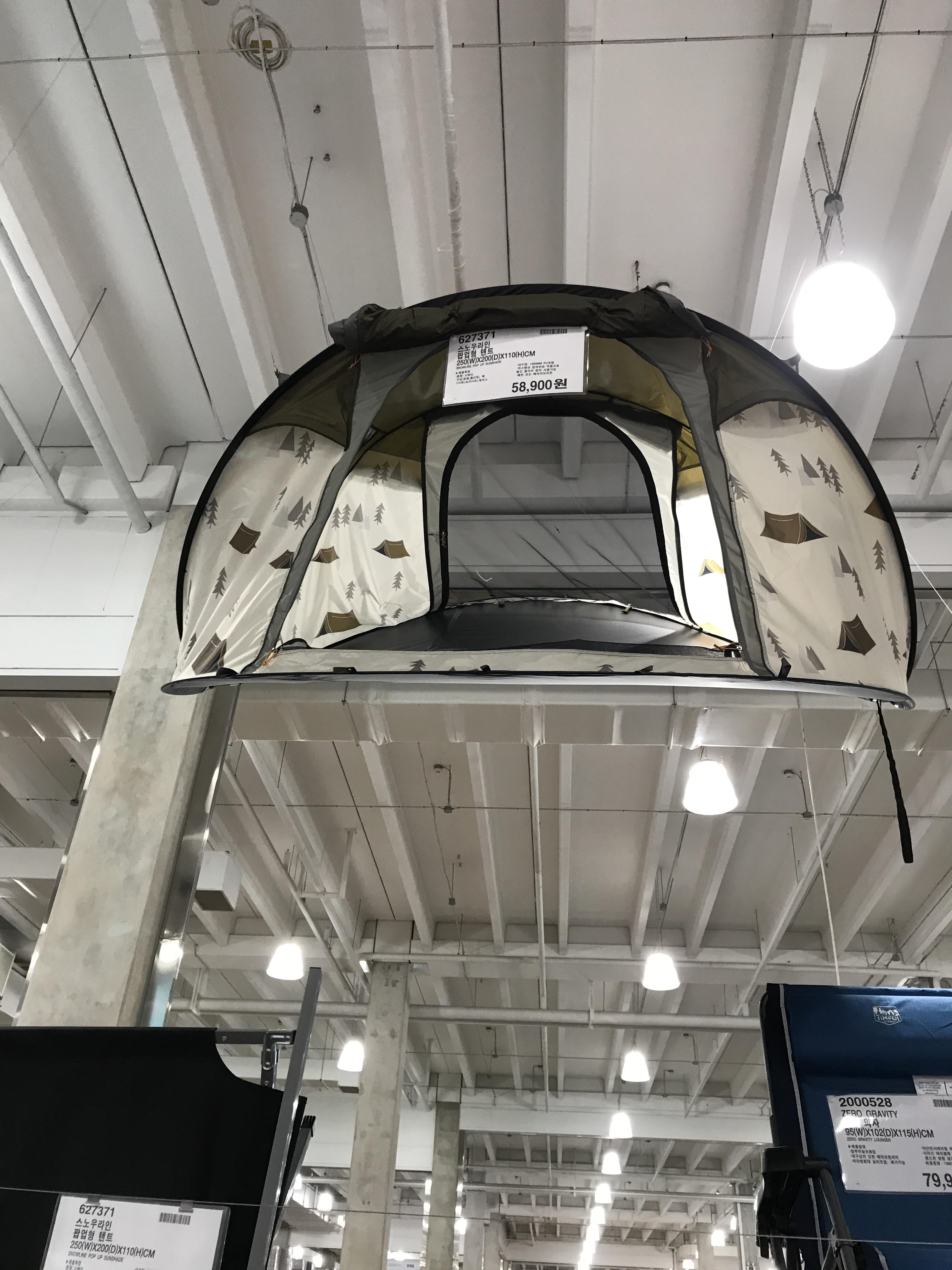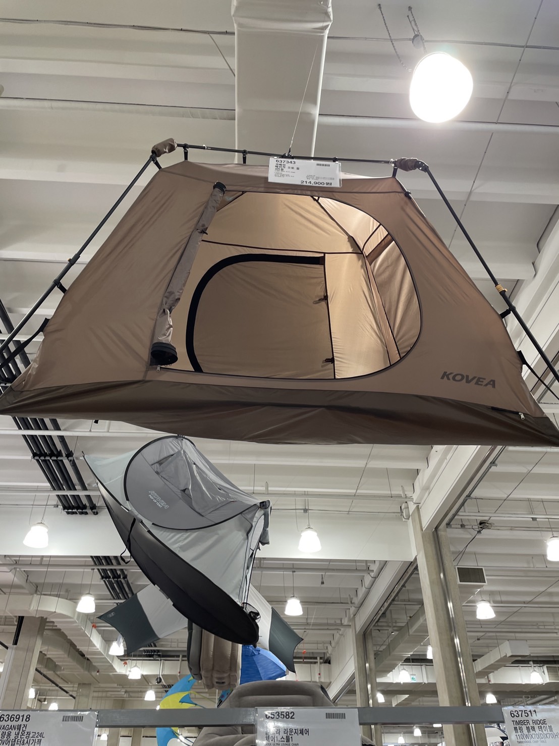 가장 먼저 천장에 전시되어 있는 코베아 텐트가 보인다. 코베아 베이직 오토돔 214,900원